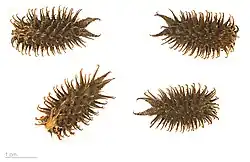 Rostlina se rozmnožuje výhradně semeny, jedna rostlina vytváří průměrně 400 až 500 plodů. Zralým plodem je vejčitá trnitá dvounažka měřící od 10 do 15 mm, mající na vrcholu dva hákovité ostny. V dvounažce jsou dvě nestejně velká zploštělá semena tvarem, barvou i velikosti připomínající slunečnicová semena. Plody jsou roznášeny do okolí převážně zvířaty, jimž se zachytávají za srst. Také plavou, mohou se rozšiřovat přívalovými dešti a přirozeným tokem řek.