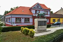 Náměstí U Lva s památníkem věnovaným občanům Řeporyj, kteří zahynuli ve 2. sv. válce -