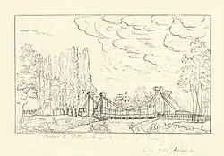 Most měl rozpětí 120 stop (29,71 metrů) a šířku 4 metry.[1] Bylo na něj spotřebováno 3,5 tuny kujného železa.[1] Řetězy byly kotveny do čtyř zděných kotevních bloků. Na každé straně mostu bylo 19 závěsných tyčí, které nesly podélné nosníky. Na tyto nosníky byly uloženy příčníky. Mostovka byla ze dřeva. Zábradlí bylo tvořeno z drátů ovinutých kolem závěsných tyčí.[1]