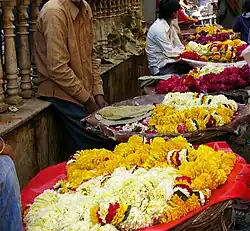 Květinová girlanda prodávaná mimo chrám Banke Bihari ve Vrindávanu, Indie