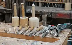 Krácení dřeva a hrubé obrábění se provádí motorovými pilami v exteriéru, nebo v interiéru s elektrickými nebo akumulátorovými řetězovými pilami. V oblibě jsou uhlové brusky, se speciálními kotouči a mnohdy i nádstavci. Používaná je celá řada strojů od přímých brusek, přes mikronářadí až po řezbářské kopírky a CNC stroje.[1]