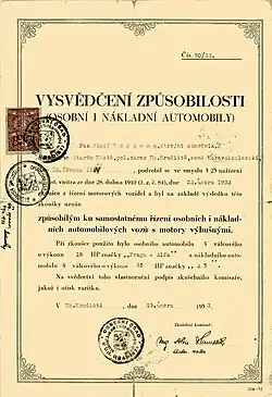 - ↑ ČTK; DVOŘÁK, František. První řidičský průkaz získal před 130 lety vynálezce auta Benz. iDNES.cz [online]. 2018-08-02 [cit. 2020-01-20]. Dostupné online.
