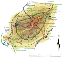 - červená: Strzelin – Szańcowa – Gościęcice Średnie – Skrzyżowanie pod Dębem – Gromnik – Dobroszów – Kalinka – Skrzyżowanie nad Zuzanką – Źródło Cyryla – Ziębice – Lipa – Rososznica – Stolec – Cierniowa Kopa – Kolonia Bobolice – Kobyla Głowa – Karczowice – Podlesie – Ostra Góra – Starzec – Księginice Wielkie – Sienice – Łagiewniki – Oleszna – Przełęcz Słupicka – Sulistrowiczki – Ślęża – Sobótka[3]