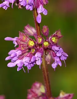 Nad listy, z vrcholu lodyhy nebo jejích větví, vyrůstá v bohatých lichopřeslenech 20 až 30 květů vytvářející terminální lichoklas. Květy, vměstnané v paždích nepatrných, nazpět ohnutých listenů, jsou souměrně pětičetné, mají krátké stopky a po odkvětu se sklápějí dolů. Dvoupyský kalich je zelený až fialový, asi 6 mm dlouhý, horní pysk se dělí do tří cípů a spodní do dvou. Koruna je také dvoupyská, růžová až fialová, asi 12 mm dlouhá, horní pysk je rovný a spodní dvoulaločný, korunní trubka je přímá a dvakrát delší než kalich. V koruně jsou vpředu dvě delší, plodné tyčinky a vzadu dvě zakrnělé patyčinky. Fertilní tyčinky ční z koruny společně s dvouramennou bliznou na nitkovité čnělce sehnuté na dolní pysk. Pod svrchním semeníkem srostlým ze dvou plodolistů ústí žlázy produkující nektar.
