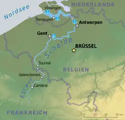 Pramení poblíž vesnice Gouy ve francouzském departementu Aisnenadmořské výšce 97 m. Protéká městy Cambrai, Valenciennes (Francie), Tournai, Gent a Antverpy (Belgie).