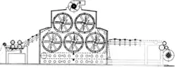 (3) Sušicí ústrojí sestává ze 3–15 bubnů vyhřívaných párou o tlaku až 50 N/cm2. U moderních strojů bývá na sušicí ústrojí napojeno zařízení na rekuperaci tepla, které vede sálající horký vzduch zpět k sušicím bubnů