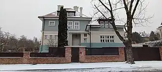 Třípodlažní nárožní dům na členitém půdorysu stojí ve svažité zahradě, ohrazené zdí z cihel a plotem. Vstupní brankou se obrací na sever do ulice Na Ořechovce, k ústřednímu objektu kolonie. Stěny jsou členěny vodorovnými pruhy, střídavě z režného zdiva z bílých cihel a omítaného se světle modrou omítkou. Jejich rytmus umocňují masivní římsy. Zádveří vchodu má dekorativní stěnu ze střídavě kladených cihel.