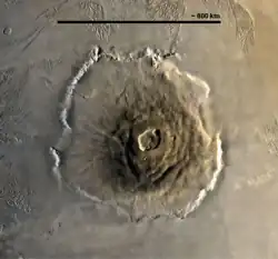 Vulkanická aktivita byla pozorována i na Marsu, kde podobně jako na Zemi, je možné se setkat s několika rozdílnými typy sopek. Štítové sopky se vyskytují ve dvou hlavních oblastech: v okolí štítové sopky Elysium Mons a pak v oblasti Tharsis, kde se nachází několik obrovských štítových sopek v čele s největší horou sluneční soustavy Olympus Mons. Dál se zde vyskytují např. Tharsis Tholus, Ascraeus Mons, Pavonis Mons, Arsia Mons a desítky menších těles. Jelikož je na Marsu menší gravitační působení na povrchu, mohou sopky být mnohem větší, než by mohly být na Zemi, protože k jejich gravitačnímu kolapsu dojde později.[9]