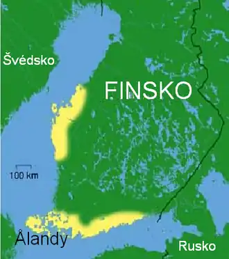 Území, kde se hovoří finskou švédštinou, jsou vyznačena žlutě