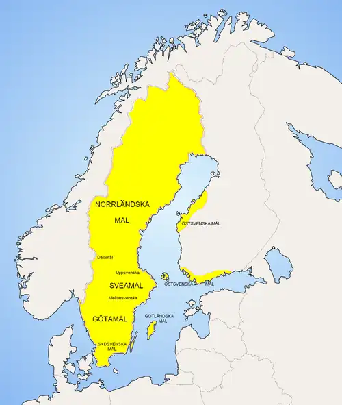 • Norrländska mål (norlandská, severošvédská nářečí) – Norrland (severní polovina Švédska); vyznačují se redukcí koncovek po historicky dlouhých slabikách.