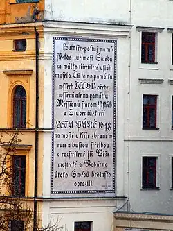 Poutníče, postuj na místě, kde zuřivost Šwédů za wálky třicetileté ustáti musela. Čti to na památku wssech ČECHŮ, přede wssemi ale na památku Měssťanů staroměstských a Študentů, kteří LETA PÁNĚ 1648 na mostě u kříže zbraní w ruce a hustou střelbou z rozstřílené již Wěže mostecké a Wodárny útoky Šwédů hrdinsky odrazili.