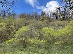 Východní část území je tvořena především invazivním druhem trnovník akát (Robinia pseudoacacia). Tento druh zasahuje až do ochranného pásma přírodní památky,[4] čímž narušuje a díky své schopnosti měnit složení půdy, ve které roste, negativně ovlivňuje původní rostlinná společenstva tohoto území.[10] Trnovník akát se šíří, jelikož zde byl při dřívějším způsobu lesního hospodaření záměrně vysazován.[4]