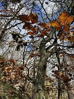 Druhým hlavním typem rostlinného společenstva přírodní památky je vegetace s lesním charakterem. Tyto druhy se vyskytují především v severní části chráněného území v jehož středu mají ještě původní charakter acidofilní teplomilné doubravy. Stromové patro je tedy zastoupeno především druhem dub zimní (Quercus petraea), ojediněle se zde ovšem může vyskytovat i jeřáb břek (Sorbus torminalis). Bylinné patro doubravy je vyvinuto pouze ostrůvkovitě a kromě druhů které zasahují i do skalního bezlesí – kokořík, ožanka a kakost se zde nachází například i rozrazil lékařský (Veronica officinalis), jestřábník hladký (Hieracium laevigatum) a tolita lékařská (Vincetoxicum hirundinaria). Keřové patro zde zastupuje opět jalovec obecný.