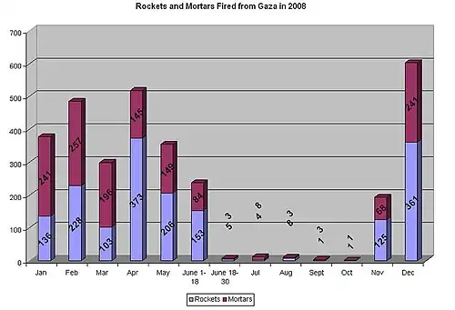- ↑ Summary of rocket fire and mortar shelling in 2008 [PDF]. Intelligence and Terrorism Information Center, 2009-01-01 [cit. 2009-08-21]. Dostupné v archivu pořízeném dne 2011-05-24. (anglicky)