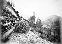 První transkontinentální železnice, která byla schválena roku 1862 a silně podporována federální vládou, byla vyvrcholením desetiletí trvajícího snah o vybudování takové trasy a byla jedním z vrcholných úspěchů prezidentského úřadu Abrahama Lincolna. Dokončila byla čtyři roky po jeho smrti. Stavba železnice vyžadovala enormní výkony v oblasti inženýrství a organizace. Stavbou byly pověřeny společnosti Union Pacific Railroad (UP) a Central Pacific Railroad, dva federálně založené podniky, které stavěly ze západu a z východu.[8] Náležitou motivací k vybudování železnice byly i snahy o spojení Unie během americké občanské války. Transkontinentální železnice podstatně urychlila osídlení západu usedlostmi, což vedlo k rychlé kultivaci nových zemědělských pozemků. Společnosti Central Pacific a Southern Pacifik Railroad pracovaly společně a oficiálně se roku 1885 spojily. Union Pacific v roce 1901 koupil společnost Southern Pacific, nicméně ji musel roku 1913 prodat, aby ji nakonec roku 1996 opět převzal.