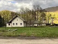 Areál pily v obci Uľanka s budovou bývalé stanice Ulmanka (v pozadí vpravo), která se dochovala do současnosti