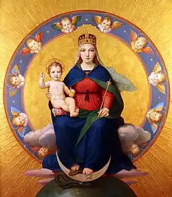 Žena ze Zjevení je nejčastěji identifikována s Pannou Marií, byť existují i jiné výklady. Popis ženy oděné sluncem v prvních verších dvanácté kapitoly měly pro mariánskou ikonografii důležitou roli. Zde se zmiňuje koruna s dvanácti hvězdami, odění sluncem se často realizovalo jako mandorla za celou postavou a podle Jana měla apokalyptická žena stát na měsíci (Maria stojící na srpku měsíce).