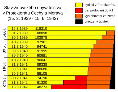 V den vzniku Protektorátu se na tomto území nacházelo přes 120 tisíc Židů. Asi 30 tisíc z nich emigrovalo, ať už dobrovolně či pod nacistickým nátlakem. Téměř všichni zbylí protektorátní Židé (přes 81 tisíc osob) byli deportováni do koncentračních táborů, z nichž přežilo jen asi 10 500 lidí. Okolo deseti tisíc dalších Židů upřednostnilo před deportací sebevraždu.[1]
