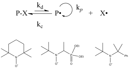 Polymerizace řízené stabilními radikály mají dvě varianty, polymerizace řízené nitroxidy a polymerizace řízené verdazyly. První z nich byl objeven při zkoumání rychlostí iniciace radikálových polymerizací katalyzovaných pomocí TEMPO. Spojení stabilního radikálu s polymerním radikálem je vratné, terminace je vratná a koncentraci propagovaných radikálů lze snížit na úrovně umožňující řízenou polymerizaci. Podobně jako u (níže uvedené) polymerizace s přenosem atomů je rovnováha mezi neaktivními částicemi (vratně terminovanými stabilním radikálem) a aktivními řetězci (radikály schopnými navázat další monomer) výrazně posunuta ve prospěch neaktivního stavu.