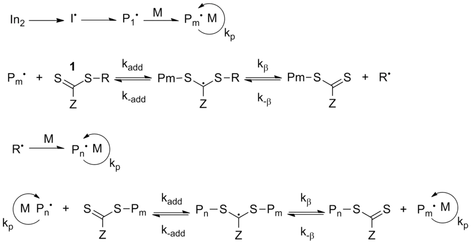 RAFT je založen na degenerativním přenosu řetězce. Činidla pro RAFT po reakci s iniciátory, například azobisizobutyronitrilem, vytvářejí, propagované řetězce nebo polymerní radikály. Polymerní řetězec se následně navazuje na vazby C=S za vzniku meziproduktu v podobě stabilizovaného radikálu. V ideálním případě se tyto radikály neterminují, ale navazují další monomery. Řetězec navazování na C=S a fragmentací probíhá do spotřebování monomeru nebo iniciátoru. Terminaci omezuje nízká koncentrace aktivních radikálů. První práce popisující RAFT byly vydány v letech 1998 a 1999.