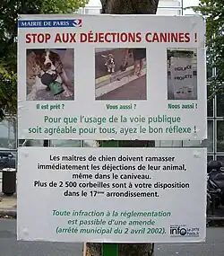 Paříž je rovněž neslavně proslavená psími exkrementy na chodnících. Přibližně 150 000 psů produkuje asi šestnáct tun výkalů denně, často uprostřed chodníku kvůli neukázněnosti jejich majitelů. To má za následek velké náklady na úklid veřejných komunikací, které platí obec. Tyto výkaly jsou obyvateli považovány za hlavní problém znečištění ve městě.[6] Zanedbatelný není ani sociální dopad, protože každý rok dojde přibližně k 650 nehodám v důsledku uklouznutí a pádu, které si vyžádají akutní ošetření, zejména u starších pacientů. Po letech laxního přístupu se pařížská radnice rozhodla zpřísnit znečišťování a od roku 2007 činí průměrná pokuta 183 €. Přesto toto opatření nemá velký vliv na čistotu pařížských ulic.