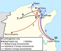 Pohyby vojsk, povstalci (červená), Hanno (fialová) a Hamilkar (černá)