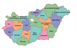 Celá země je rozdělena do 19 žup a území hlavní města Budapešti, které má zvláštní statut.[2] Podoba žup vychází z historického členění uherského, přičemž nejvíce rozdílů mezi ním a současným členěním je ve východní polovině státu, kde například bývalá župa Bihar je v rámci moderního Maďarska rozdělena mezi župu Hajdú-Bihar a Békés. Řada současných žup je složena z území více bývalých žup, což je zpravidla zohledněno složenými názvy, avšak například u Pešťské župy to neplatí, přestože zahrnuje též část bývalé Hontské župy.