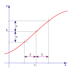 V kalkulu je (ε, δ)-definice limity („epsilon–delta definice limity“) formalizace pojetí limit. Název vznikl podle Augustina-Louise Cauchyho, který sice nikdy neformuloval definici limity ve svém Cours d'Analyse, ale občas používal argumenty ve svých důkazech. Poprvé byla formalizována Bernardem Bolzanem v roce 1817 a definitivní moderní znění nakonec poskytl Karl Weierstrass.[1][2] Tato definice dělá následující neformální výrok rigorózním: závislý výraz f(x) se blíží hodnotě L, zatímco se proměnná x blíží hodnotě c, pokud f(x) může být libovolně blízko k L, když x je dostatečně blízko k c.