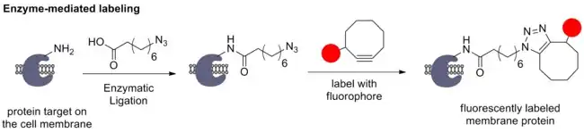 Alice Ting et al. zabudovali azidofunkcionalitu do určitých bílkovin na povrchu buněk za použití ligázového enzymu. Tyto bílkoviny byly následně označkovány cyklooktyno-fluoroforovým komplexem za vzniku fluorescenčně zbarveného proteinu.[46]
