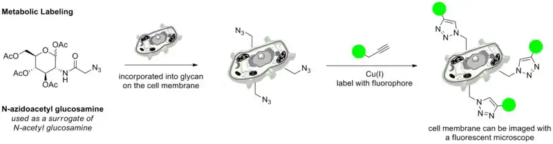 Bylo například popsáno metabolické zařazení do glykanů v buněčných membránách u azidy funkcionalizovaných sacharidů a jejich následné značkování komplexy fluoroforů s alkyny. Fluorescenčně značkovaná buněčná membrána může být zobrazena pomocí fluorescenčního mikroskopu.[44]