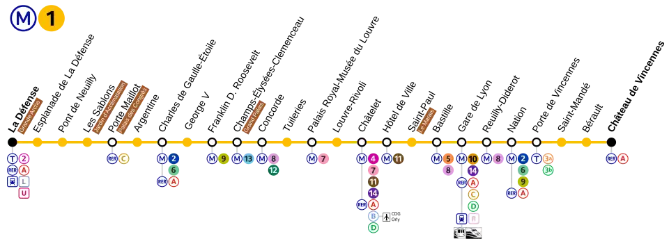| Typ linky | podzemní (La Défense – Esplanade de la Défense, Pont de Neuilly – Château de Vincennes) nadzemní (Esplanade de la Défense – Pont de Neuilly, Bastille) |