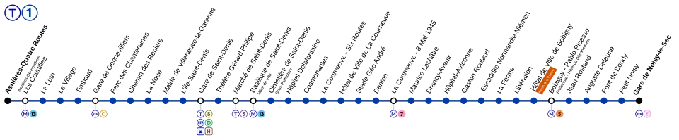 V tomto článku byl použit překlad textu z článku Ligne 1 du tramway d'Île-de-France na francouzské Wikipedii.