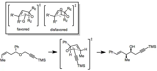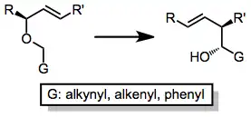Pokud je na alken navázána stabilizující skupina G, tak se stereoselektivita také zvýší. Skupiny stabilizující anionty, jako jsou (trimethyl)silyl a methylthio, obvykle zajišťují dobrou selektivitu.[11]
