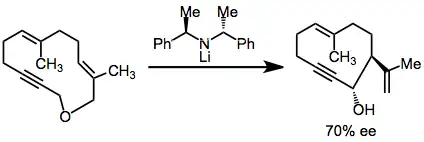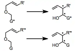 Asymetrická indukce je založená na stereocentrech, která jsou přítomna ve výchozí látce a nejsou ovlivněna reakcí. Účinného provedení reakce tímto způsobem lze dosáhnout jak jejich navázáním na G skupinu,[6] tak i pomocí substituentu navázaného na konec dvojné vazby.[7] Při těchto variantách jsou běžné molární poměry diastereomerů okolo 90:10, odstranění chirálních pomocníků může však být obtížné.[8]