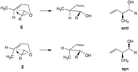 [2,3]-sigmatropní přesmyky často mají vysokou enantioselektivitu. Při tvorbě nové dvojné vazby mezi produkty výrazně převažují E-alkeny nebo trans-izomery. Stereochemie nově vzniklé vazby C-C je obtížné předvídat, může být narušena pětičlenným cyklickým meziproduktem. Z E-alkenů vznikají převážně syn- a ze Z-alkenů anti-produkty.