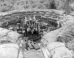 ![]() 25mm kanón v dvojhlavňovém uspořádání ukořistěný Američany na Guamu v roce 1944. Zásobníky jsou odstraněny, ale jeden je položen na bedně s municí na pravé straně. | |