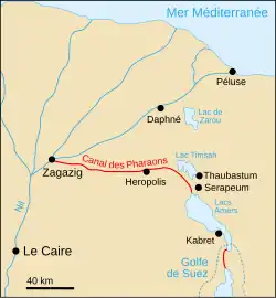 dal vybudovat (obnovit) kanál spojující větev Nilu do Pelusia přes Wadi Tumulat, vedoucí přírodní územní depresí do Rudého moře poblíž Suezu. V budoucnu se stal součástí plánů Suezského průplavu.[13] Historické úsilí vybudovat spojení Nilu s Rudým mořem se datuje již k vládě faraona Senusreta III. z 12. dynastie.