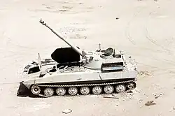 Irácká houfnice M-1974 uvízlá v poušti poté, co ji irácké síly opustily během války v Zálivu (Operace Pouštní bouře).