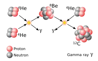 Toto beryliové jádro je nestabilní (poločas rozpadu 6,7×10−17 s) a samovolně by se rozpadlo zpět na dvě heliová jádra. Předcházející reakce však probíhá dostatečně rychle, aby v jádře hvězdy bylo stále trochu jader berylia. Ta se mohou sloučit s dalším heliovým jádrem za vzniku stabilního jádra uhlíku.