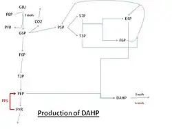 Syntéza DAHP za použití glukózy. Zkratky: GLU: glukóza; G6P: glukóza-6-fosfát; PEP: fosfoenolpyruvát; PYR: pyruvát; F6P: fruktóza-6-fosfát; P5P: pentóza-5-fosfát (ribóza- nebo xylulóza-5-fosfát); T3P: glyceraldehyd-3-fosfát; S7P: sedoheptulóza-7-fosfát; E4P: Erythróza-4-fosfát; PPS: PEP syntáza