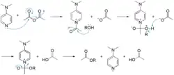 DMAP účinně katalyzuje i obtížné acylace, u kterých klasické provedení s pyridinem a anhydridem nebo acylchloridem selhává. Přídavek 0,05 - 0,2 mol. % DMAP do takové reakce je obvykle dostačující. Mechanismus acylace anhydridem je následující: