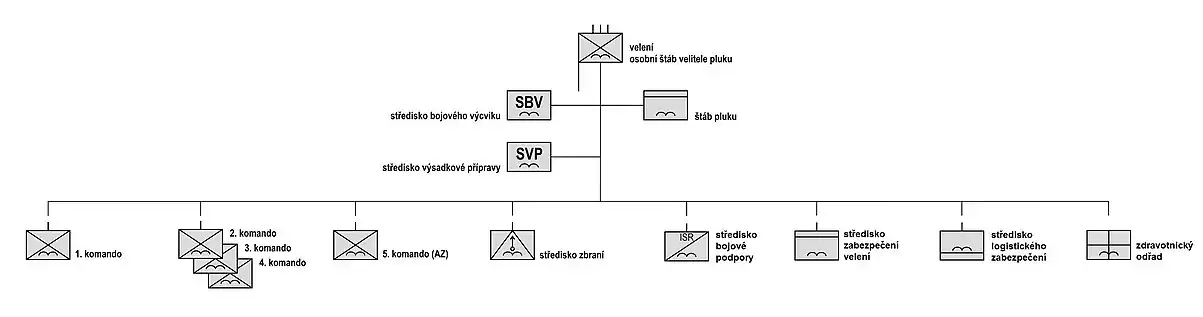 43. výsadkový pluk se v rámci Armády České republiky vyznačuje unikátní organizační strukturou. Tzv. komanda, která jsou větší než původní výsadkové roty (ale menší než prapor), podporuje několik středisek v čele s velením a štábem pluku.[2]