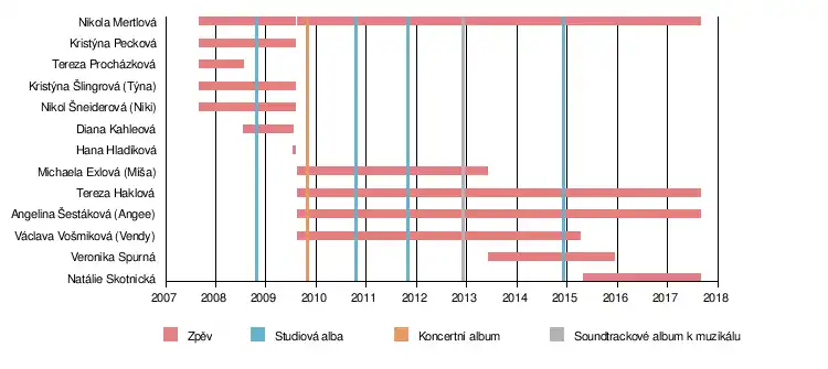 Nejstabilnější sestavu (2009 – první polovina roku 2013) tvořily Angelina Šestaková – Angee (* 2000), Michaela Exlová – Míša (* 1997), Nikola Mertlová – Nikki (* 1998), Tereza Haklová (* 2000) a Václava Vošmiková – Vendy (* 1997).