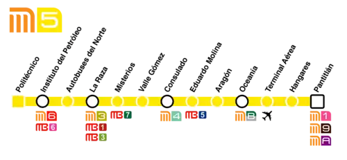 Linka 5 se kříží s linkami metra 1, 3, 4, 6, 9, A, B a linkami Metrobusu 1, 3, 5, 6, 7.