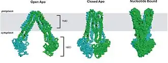 Ačkoliv je ve stavbě ABC transportérů velká rozmanitost, dají se vystopovat některé obecné rysy. ABC pumpy se skládají z 2–4 domén: některé se označují NBD (nucleotide binding domain) a jsou schopné navázat ATP, jiné jsou označovány TMD (transmembrane domain) a ty představují v typickém případě šest alfa-helixů procházejících přes membránu.[1]