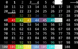 V režimu s 256 barvami (ESC[38;5;<fgcode>m a ESC[48;5;<bgcode>m) se používají následující barevné kódy: