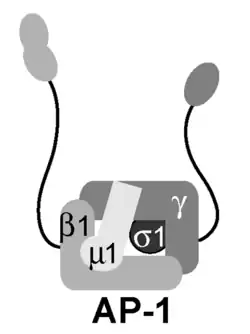 AP-1 je heterotetramerický komplex, který se vyskytuje na membránách buněčných váčků (asociuje s fosfolipidem fosfatidylinositol-4-fosfátem) a umožňuje skládání klathrinového pláště. Identita váčků, které AP-1 váže, není zcela vyjasněna – podle některých hypotéz to jsou váčky mezi trans-Golgi stranou Golgiho aparátu a endozomy, podle jiných z Golgiho aparátu či endozomů směrem na plazmatickou membránu.[1]