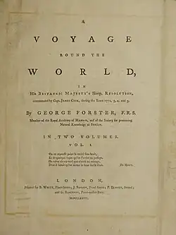 Georg Forster nebyl vázán smlouvami svého otce s Admiralitou a v červenci 1776 začal psát A Voyage Round the World, která ho plně zaměstnala na celých devět měsíců.[43][44][45] Hlavním zdrojem pro toto dílo byly deníky jeho otce. Fakta o běžných denních činnostech a pozorováních jsou obvykle převzata z těchto deníků, ale přepracována do Georgova vlastního stylu, s jiným řazením detailů a dalším spojovacím materiálem.[38][46] Některé části byly založeny na segmentech Cookových deníků, k nimž Forsterův otec získal přístup při přípravě ukázek pro lorda Sandwiche.[47][48] Georg použil své vlastní poznámky a vzpomínky, včetně vlastního memoranda Observationes historiam naturalem spectantes quas in navigationes ad terras australes institutere coepit G. F. mense Julio, anno MDCCLXXII (doslovně česky „Pozorování přírodní historie, která G. F. začal zavádět při plavbách do jižních zemí v červenci 1772, které obsahuje botanická a biologická pozorování do 1. ledna 1773“).[49]