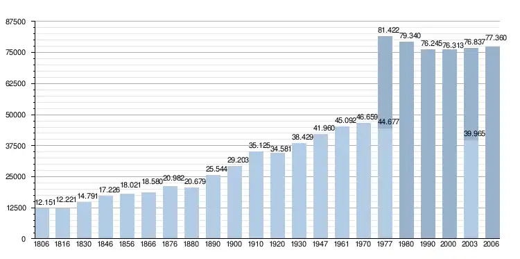 - Zdroj: NIS. Poznámka: údaje z let 1806 až 1970 včetně jsou výsledky sčítání lidu z 31. prosince; od roku 1977 se uvedený počet obyvatel vztahuje k 1. lednu