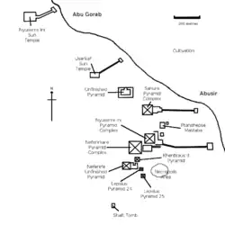 Galerie Abúsír na Wikimedia Commons- Mapa archeologických objektů v Abúsíru do roku 2019